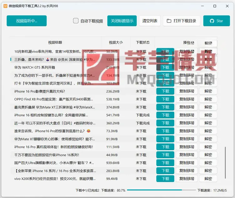 支持下载图片格式视频号;修复多个直播不显示、同时下载多个视频、视频文件过大下载失败的问题;软件界面下载状态宽度调整