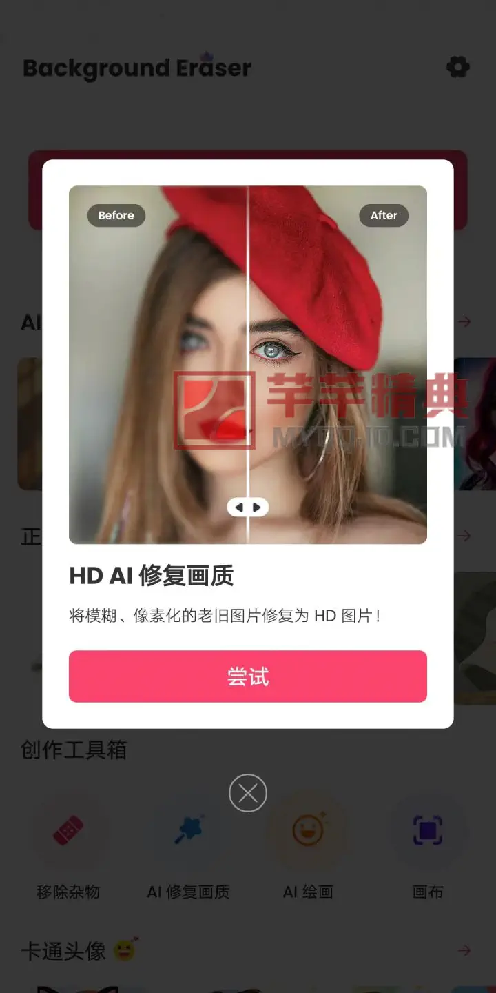 Background Eraser:智能抠图背景擦除工具,它能快速擦除无关对象,去水印、去路人、去背景、去瑕疵,精细修复图片,细节处理到位。AI自动删除背景,生成PNG格式透明背景图。