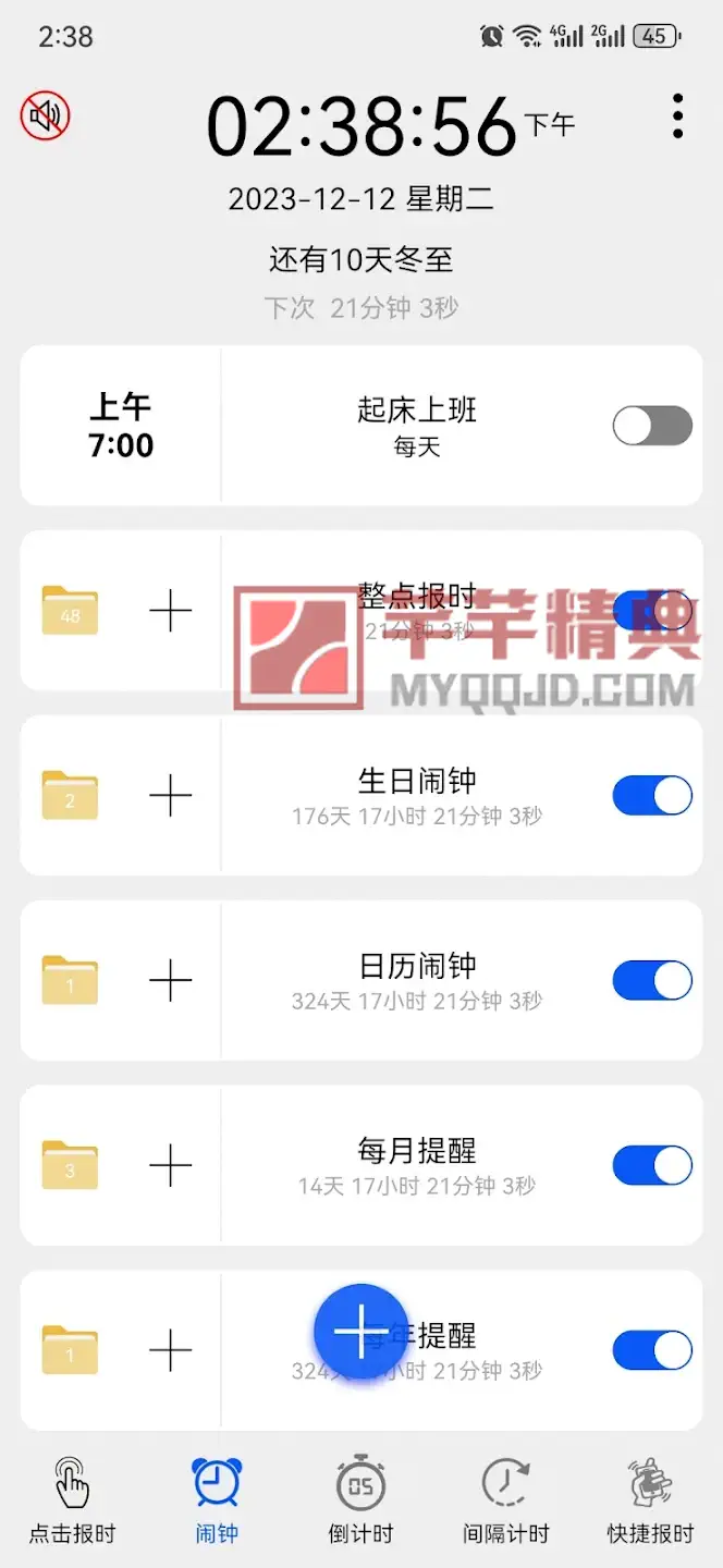 - 多类型闹钟:支持单次、每周循环、每月指定日、每年重复及自定义日期闹钟