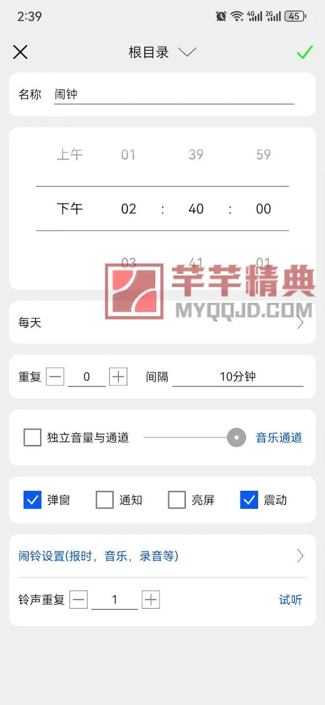 - 独立音量控制:每个闹钟可单独设置音量与声音通道(闹钟通道/音乐通道)
