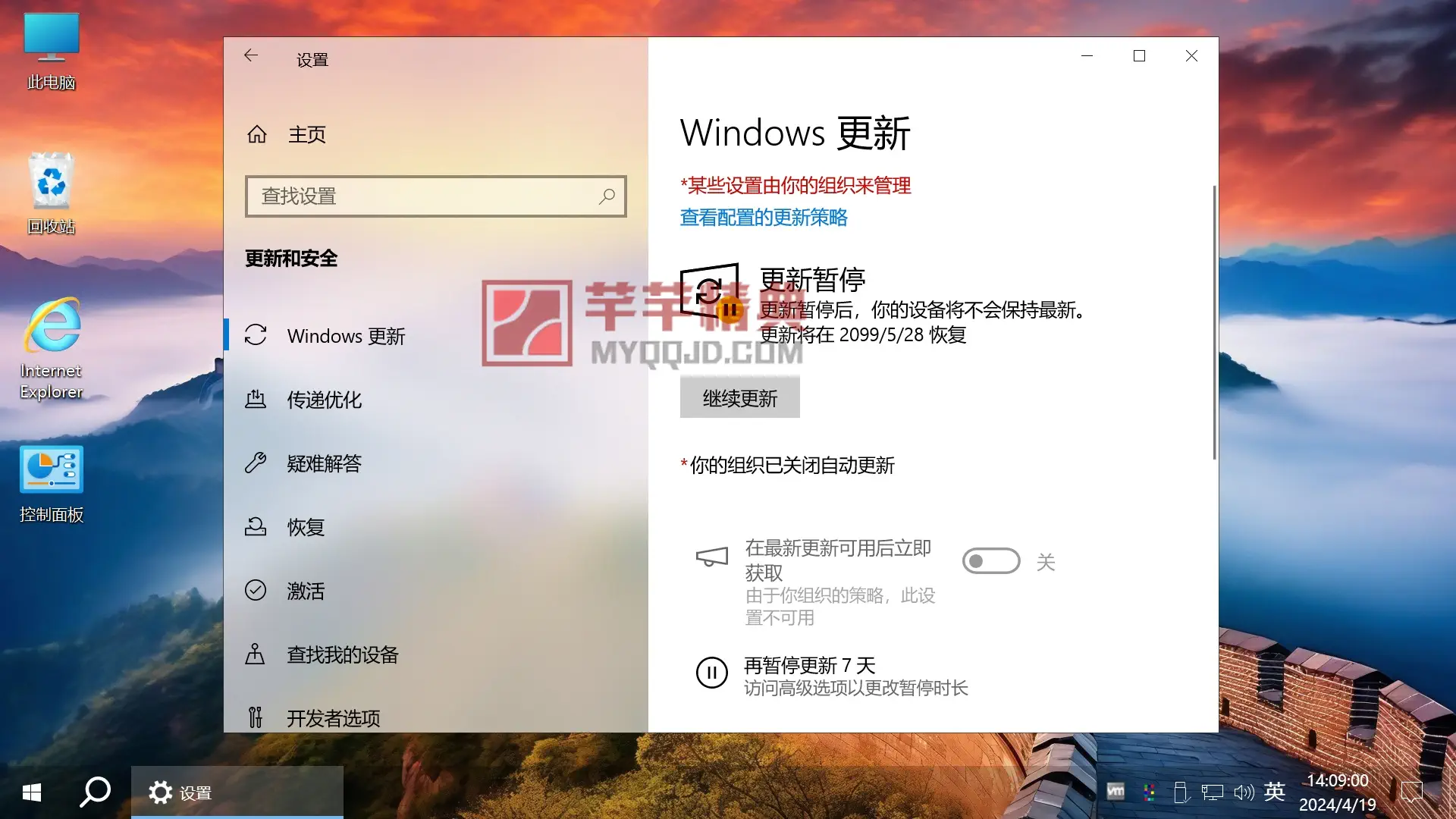 - 防止自动更新补丁,设置Windows Update暂停更新到2099年5月28日。