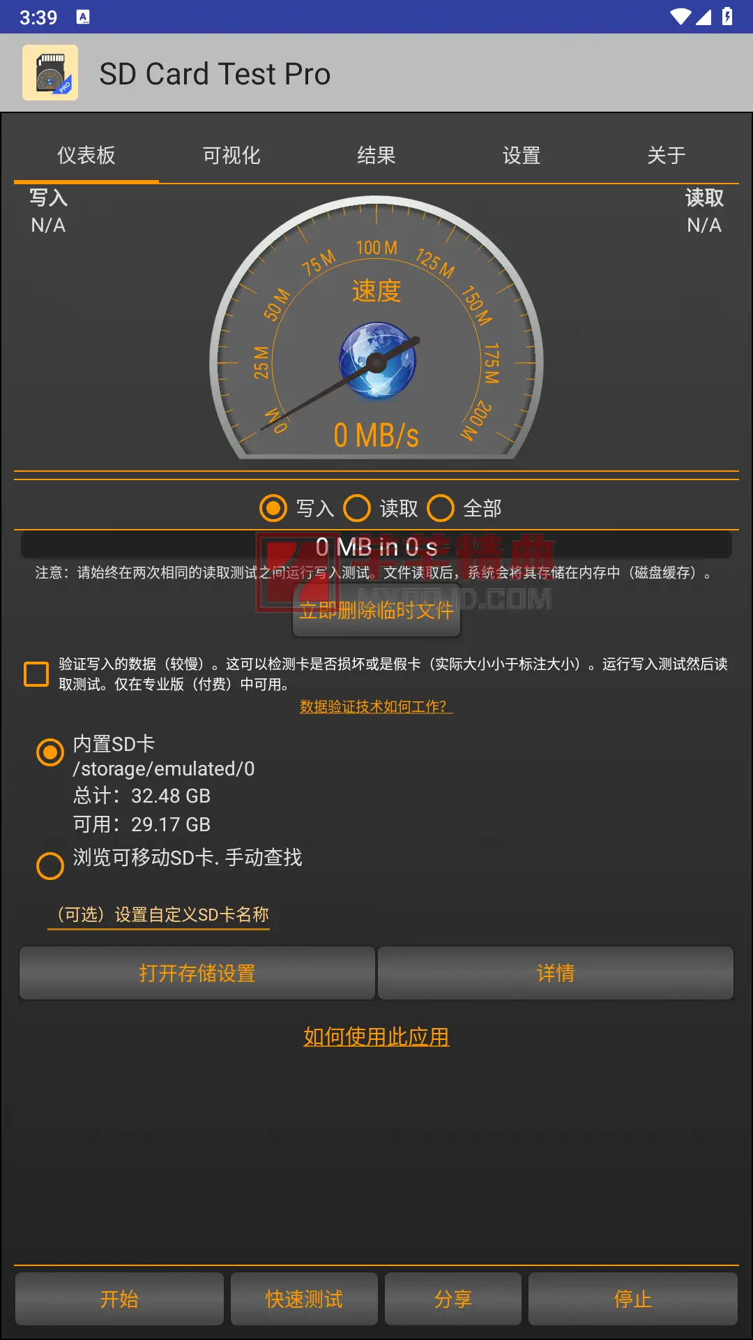 1. 选择存储目标:启动应用后,选择需要测试的“内部存储”或“外部SD卡”。