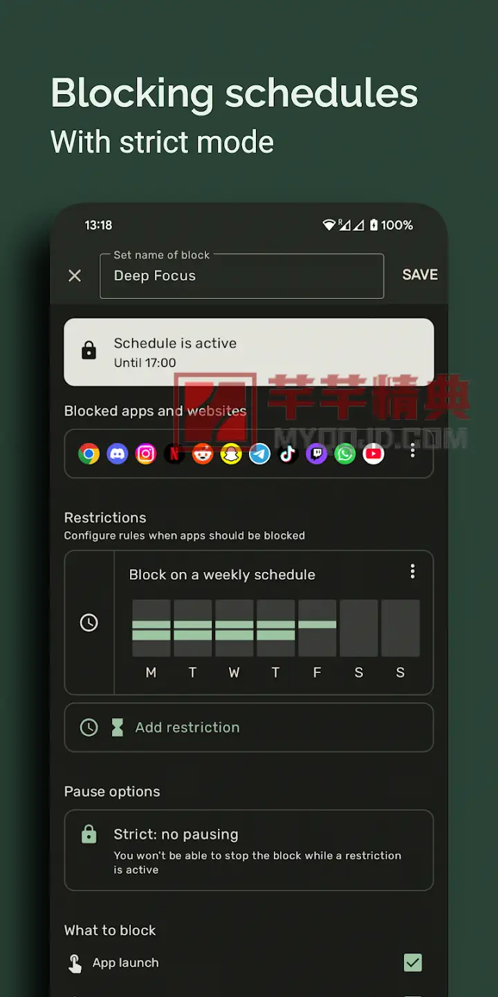 - 自定义时间表:用户可为特定应用或应用组(如社交媒体、游戏)创建详细的阻止计划,精确到一周内每天的不同时段。