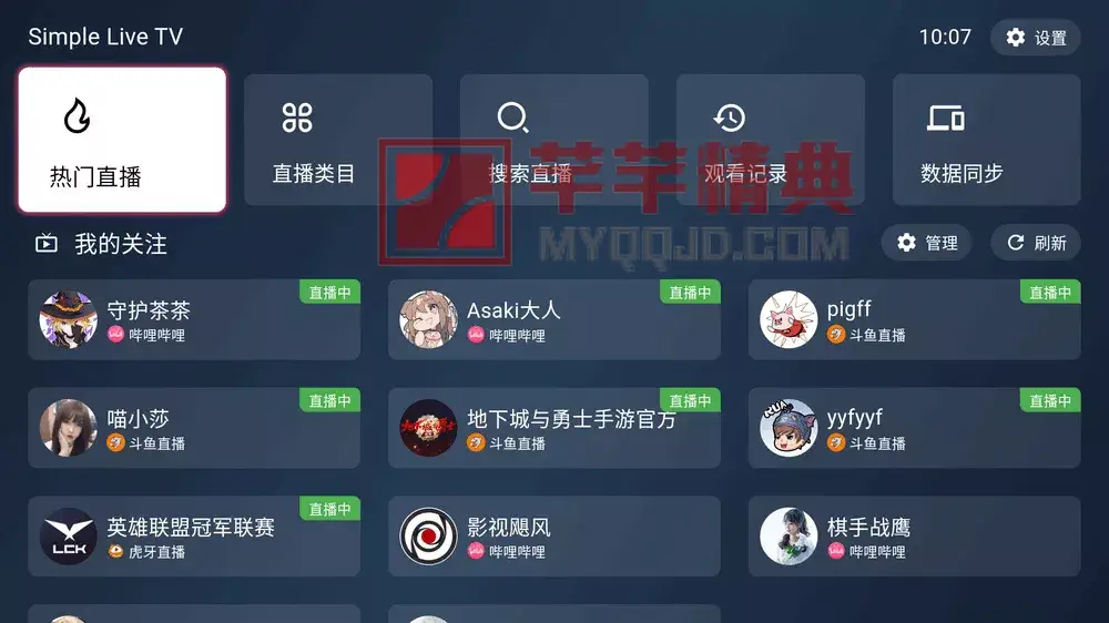 - SimpleLive TV版:主屏下半部分默认展示用户关注的主播列表。