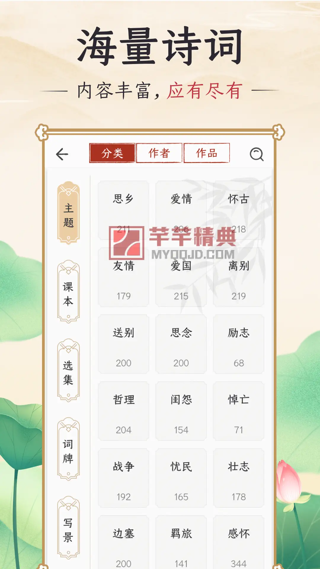 - 分类清晰:可按作者、朝代、主题(如送别、咏物、边塞)进行浏览与检索。