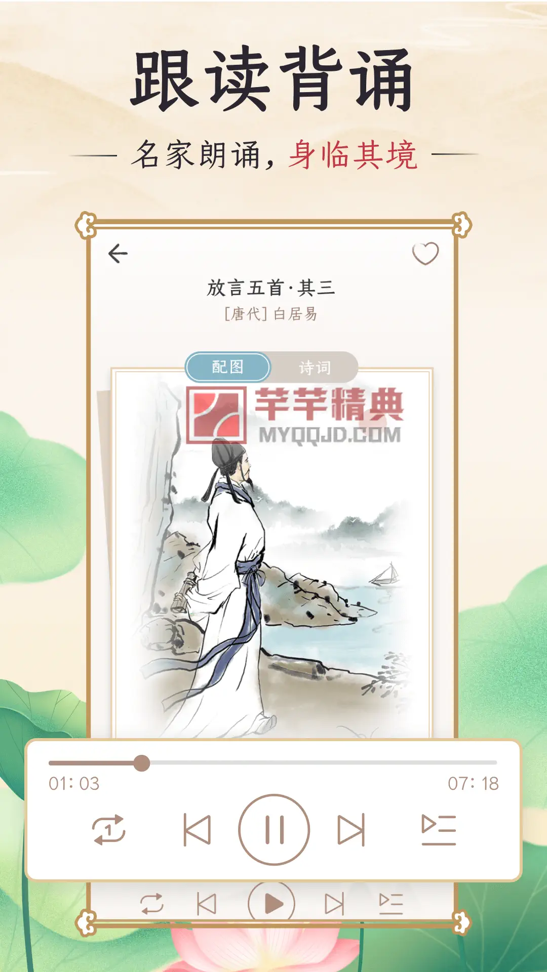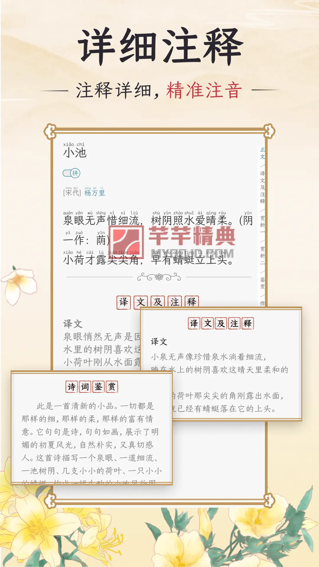 - 诗画结合:部分诗词配有古典画作或意境插图,辅助理解。