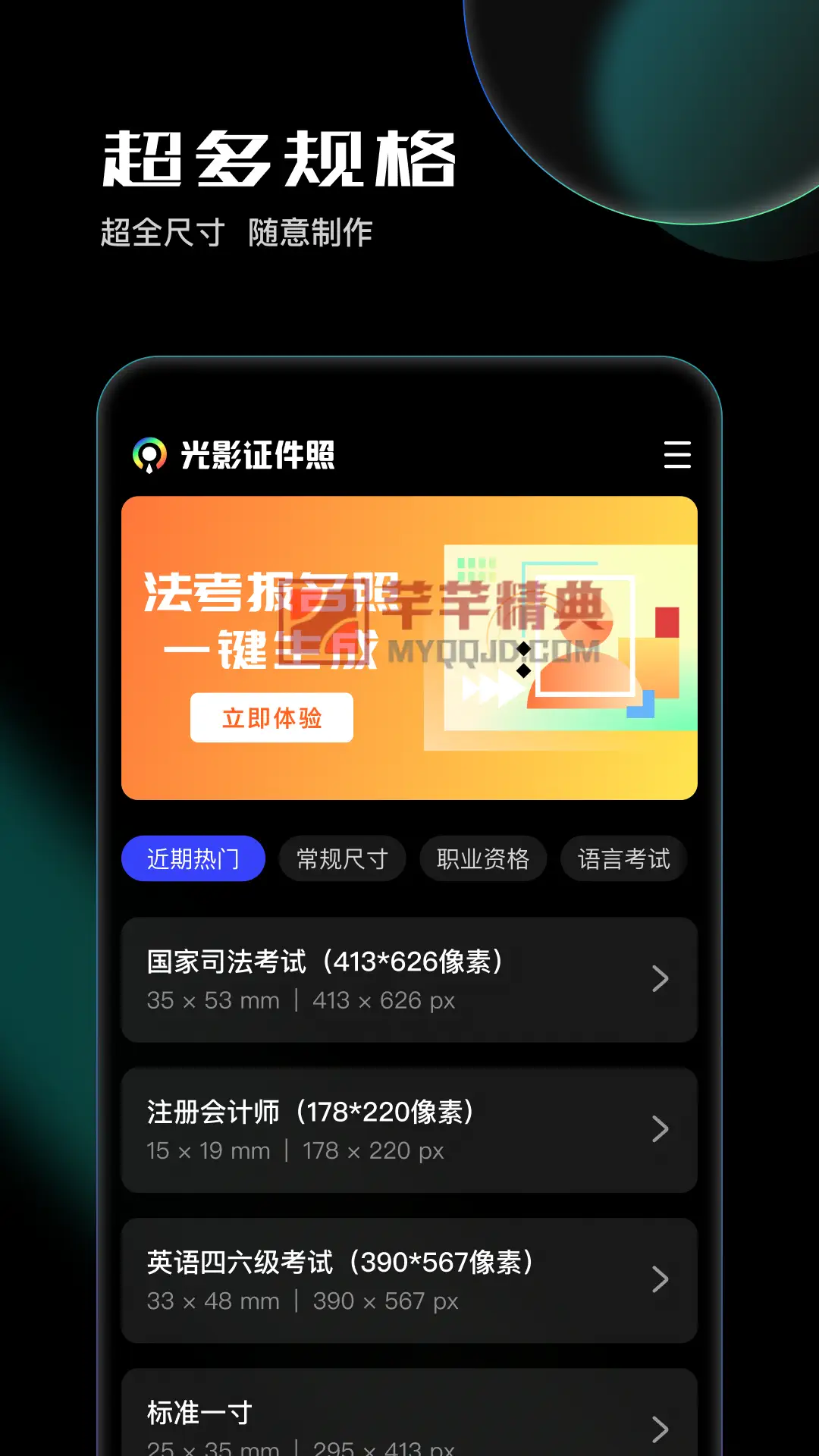 光影证件照App内置了超过100种官方指定的证件照规格,覆盖您生活中可能遇到的所有场景: