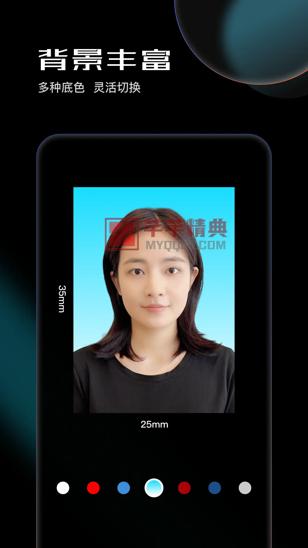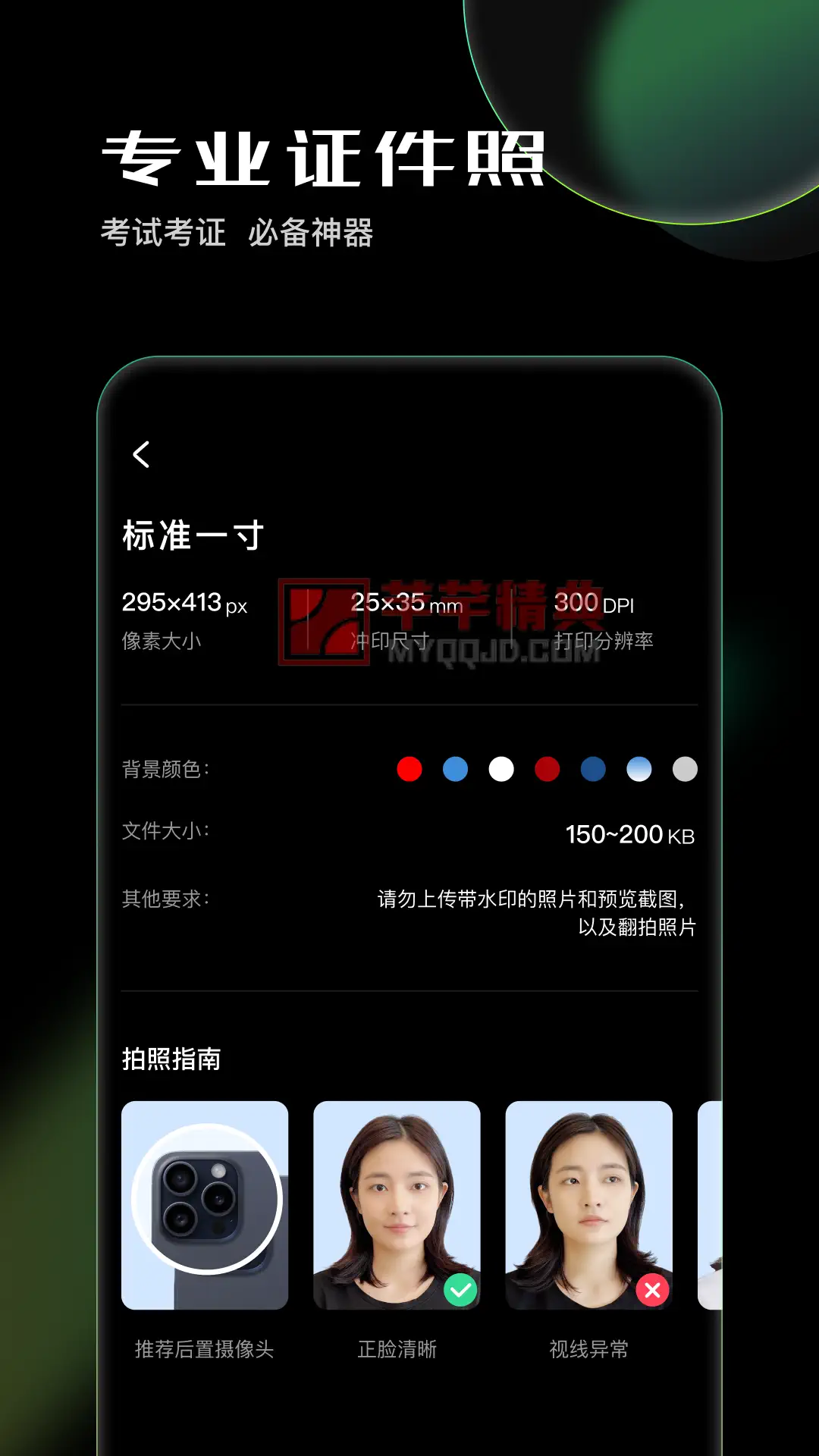 - 三步搞定:①拍照或从相册选取照片 → ②选择所需尺寸和背景 → ③保存或分享。