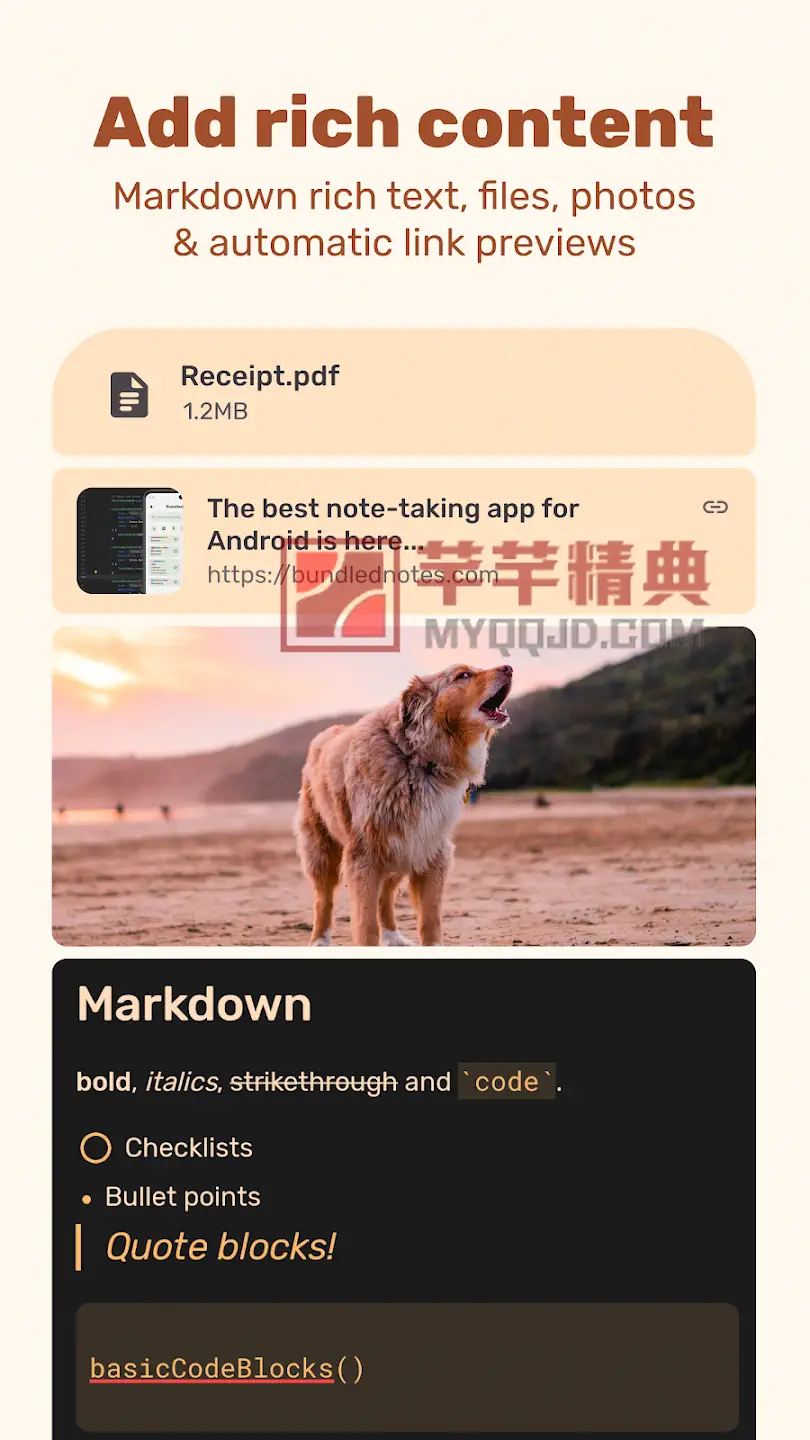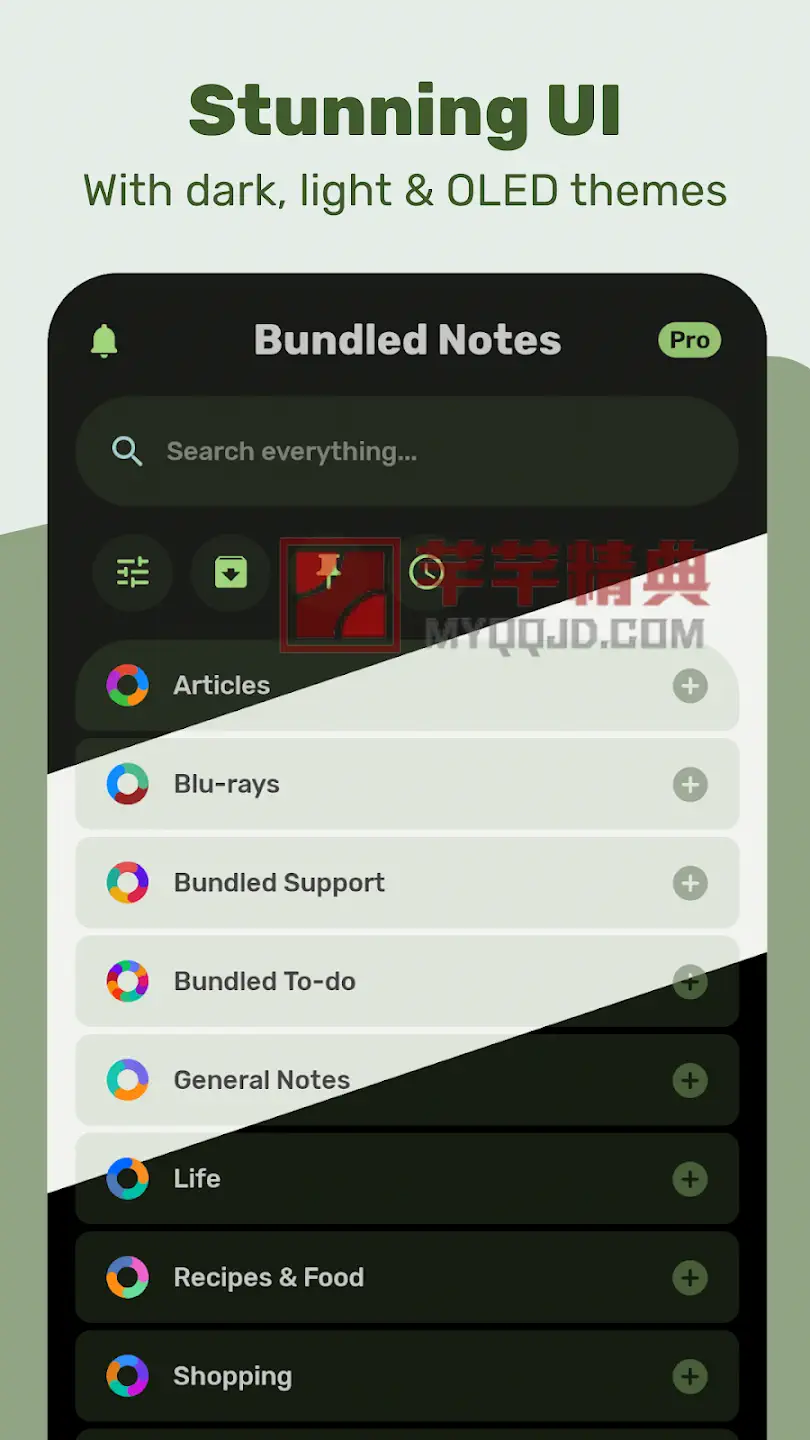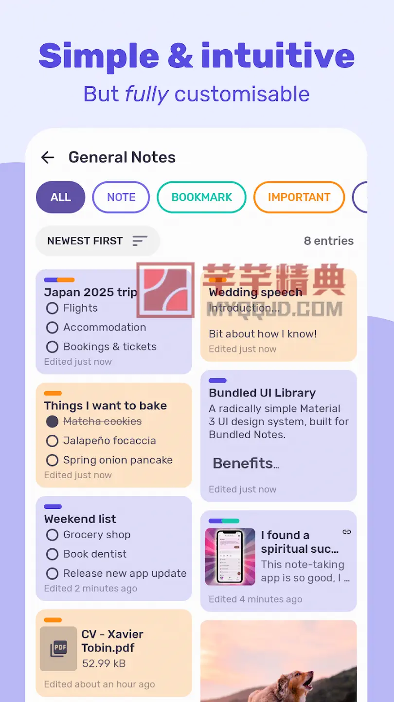 Bundled Notes 是一款集个人笔记、任务管理、项目规划、清单整理于一体的高效工具。它采用 Material You 动态主题设计,界面美观且无广告。支持 Markdown 格式、文件附件、智能提醒和跨设备同步,并提供“捆绑”(Bundles)组织方式,让您自由分类笔记、待办、书签、食谱、观影清单等任何内容。由独立开发者精心打造,无臃肿功能,核心体验完全免费。